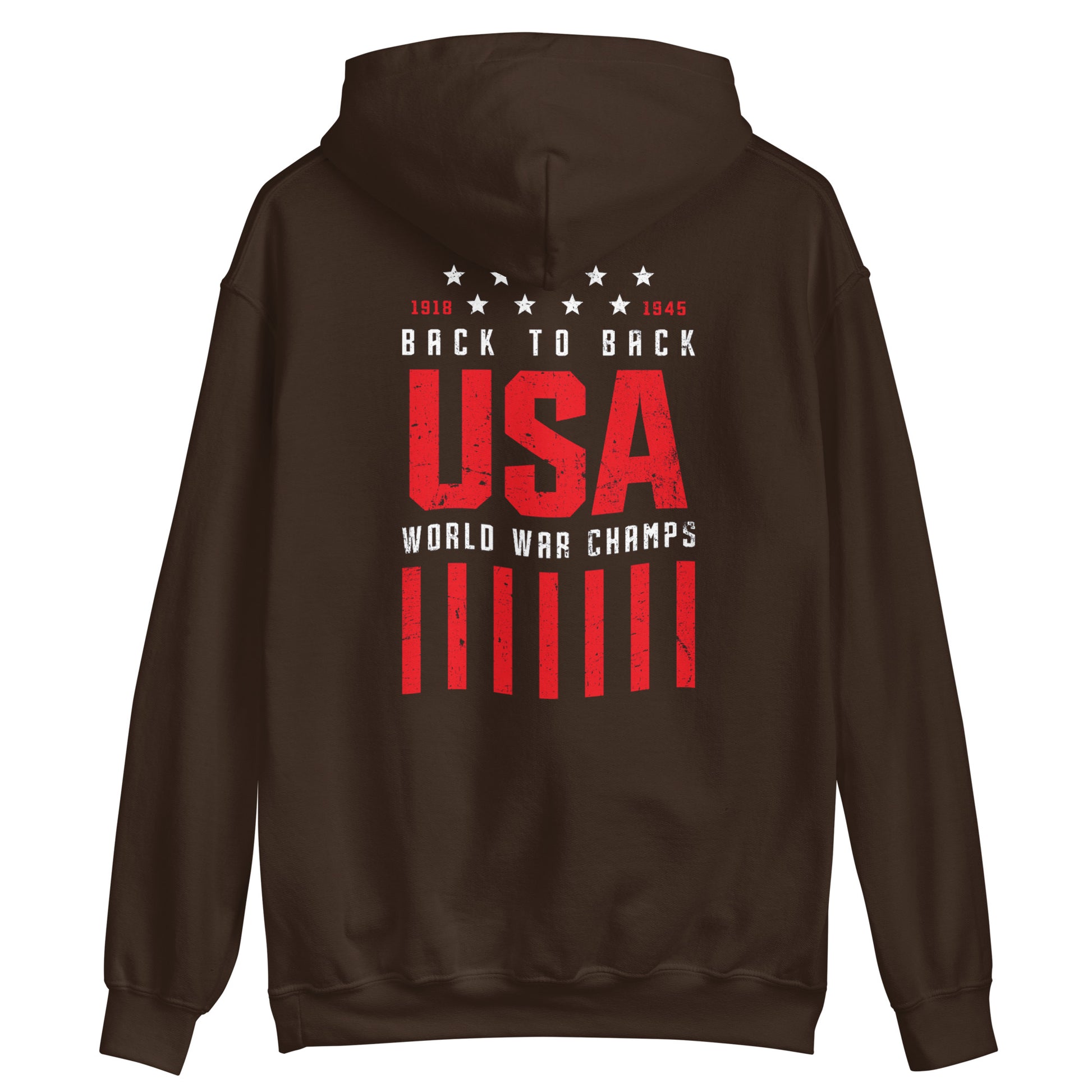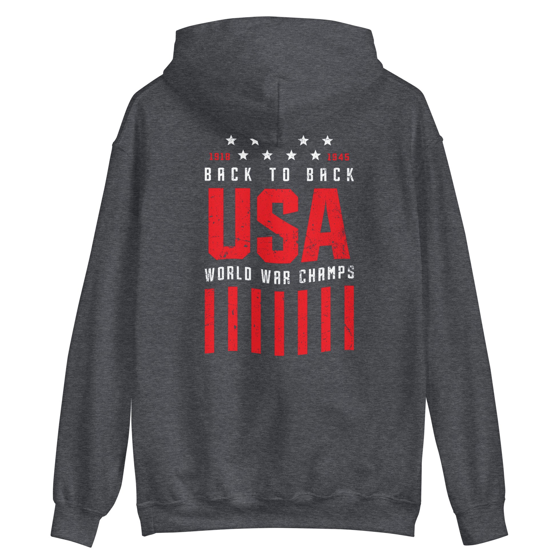 Crafted from premium materials, this hoodie ensures a soft and cozy fit, perfect for all-day comfort and warmth. Its design proudly displays the statement "1918 to 1945 Back to Back World War Champs" across the back, in bold and eye-catching lettering. The clever wording and iconic years pay tribute to the United States' role in both World War I and World War II, showcasing its resilience and victory on the global stage.