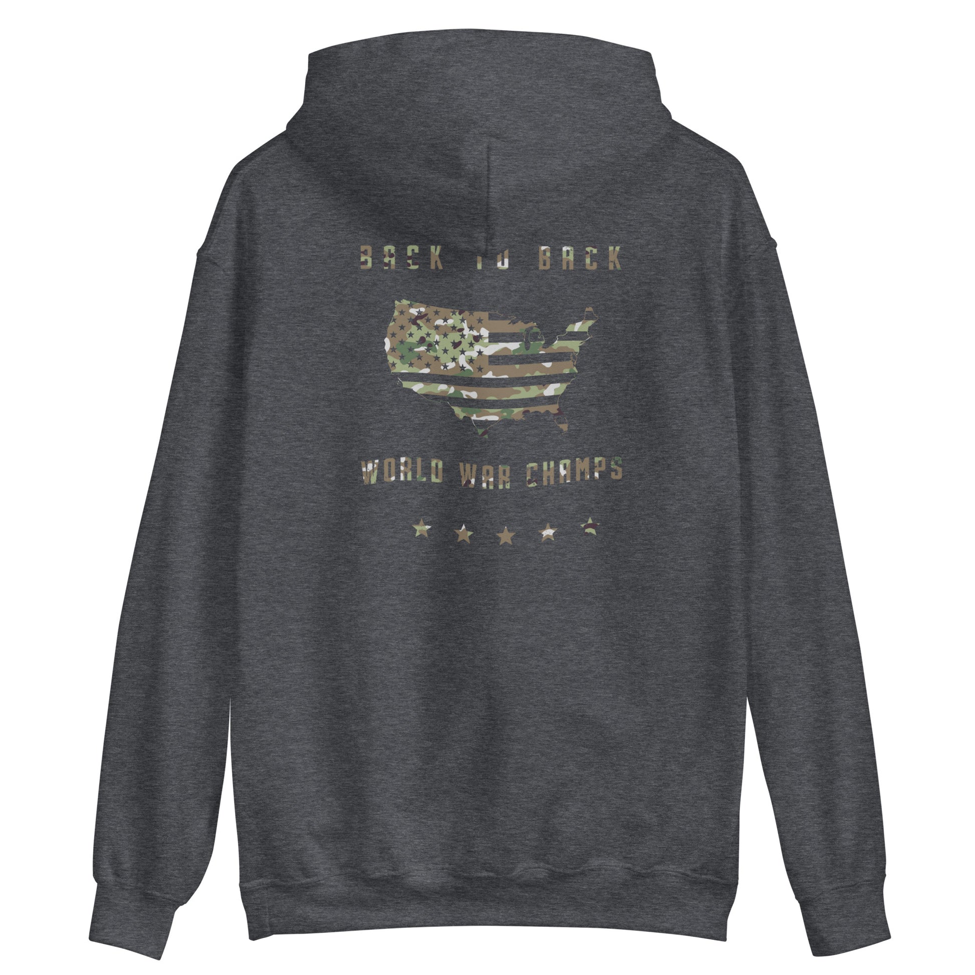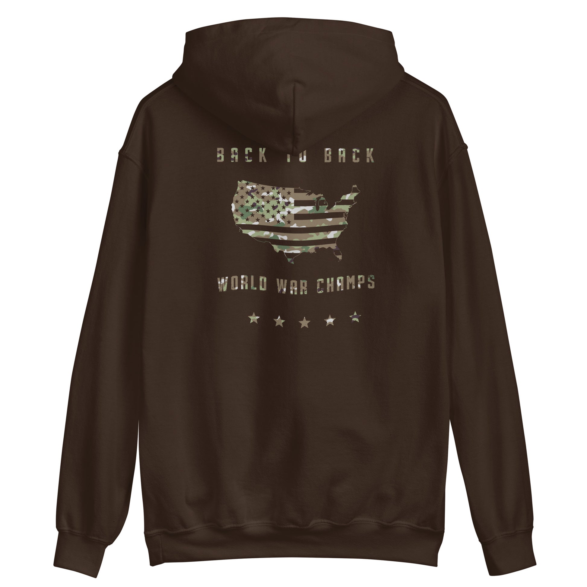 Introducing our "Back to Back World War Champs" Multicam Hoodie – a unique and stealthy twist on a classic patriotic theme. This hoodie flawlessly combines the spirit of American pride with a contemporary, tactical edge, making it an exceptional and stylish addition to your wardrobe.