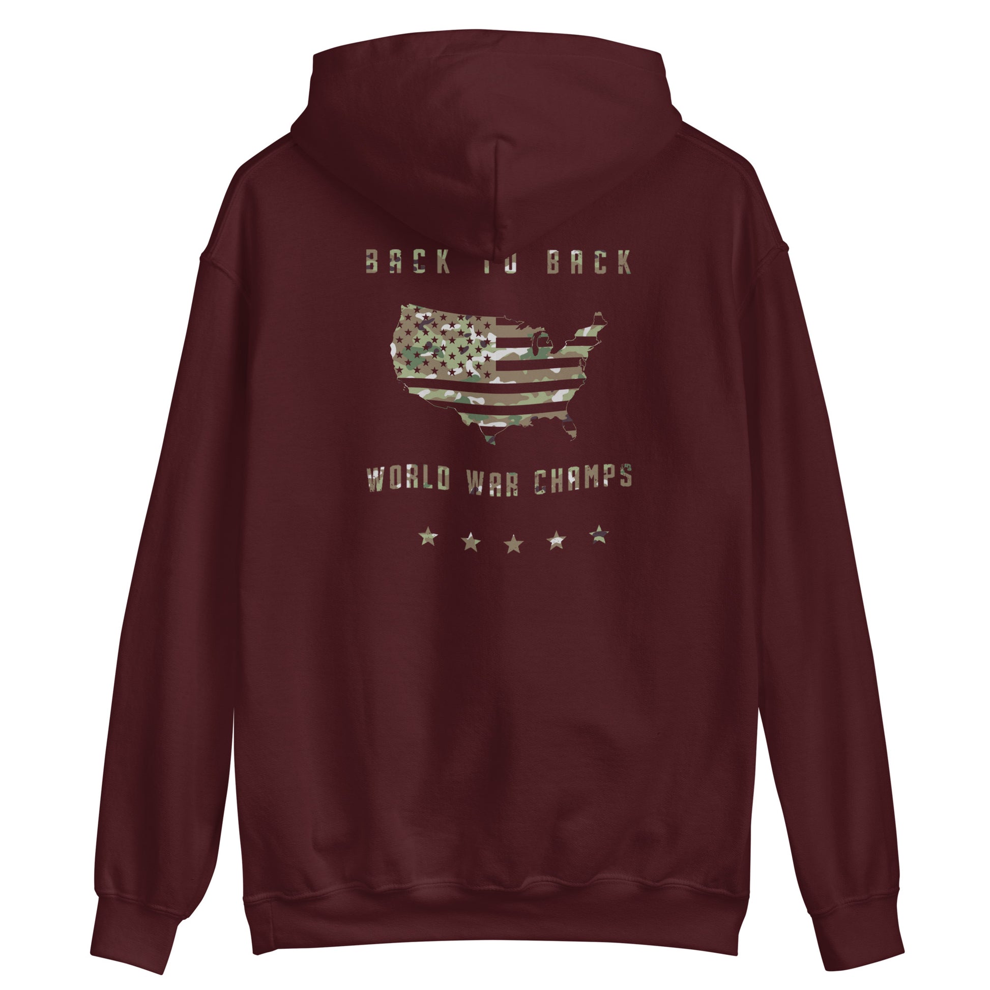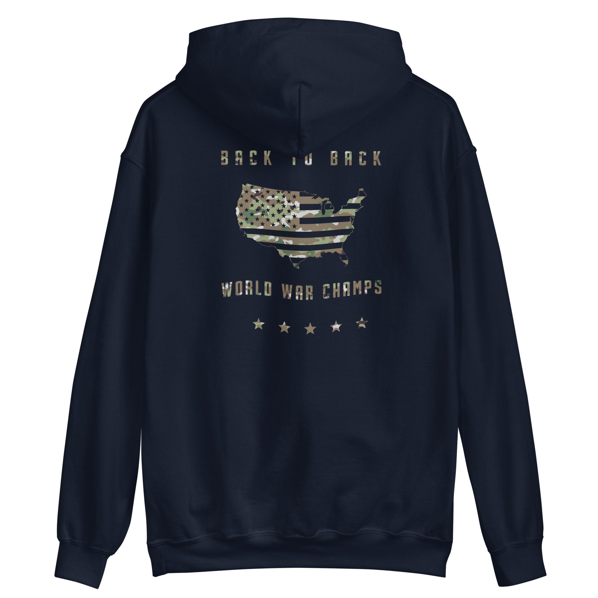 Crafted from top-quality, rugged Multicam-patterned fabric, this hoodie is designed not only for style but also for exceptional durability. The iconic "Back to Back World War Champs" slogan is prominently featured on the front in a bold and eye-catching design. The Multicam pattern infuses a touch of modern military-inspired flair, skillfully blending the patriotic message with a contemporary aesthetic.